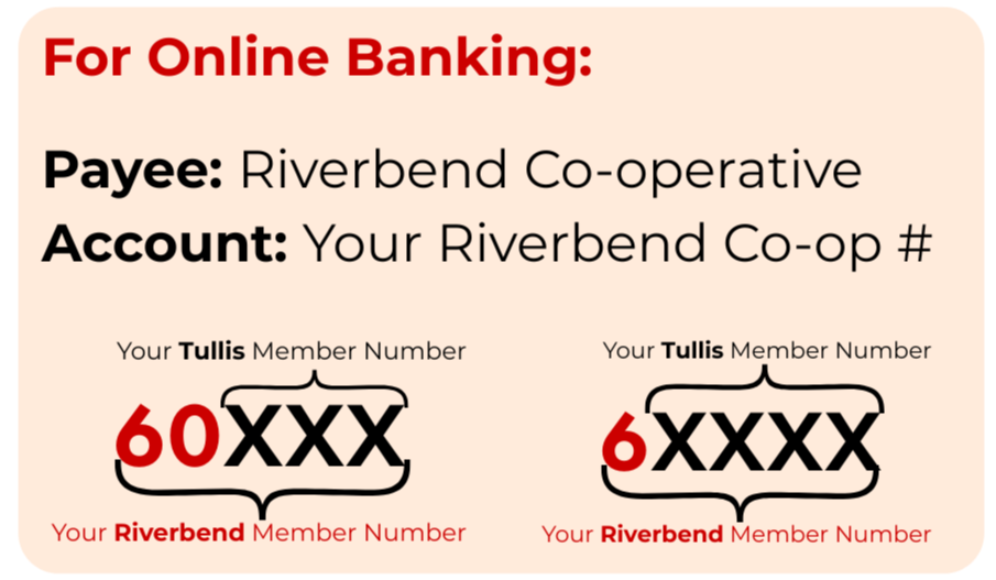 For online banking, please select Riverbend Co-operative as the payee. Use your Riverbend Co-op membership number (your former Tullis Co-op number added to 60,000) as the account number.